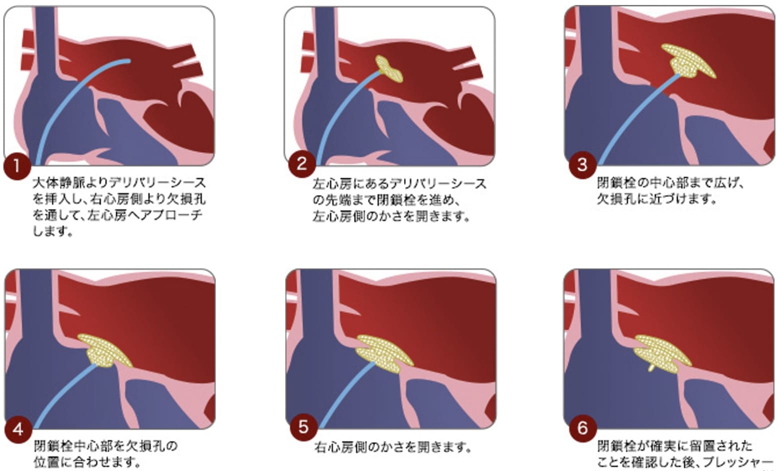 閉鎖栓を大腿静脈より挿入し卵円孔を通して心房中隔を挟み込むように留置し、閉鎖します。