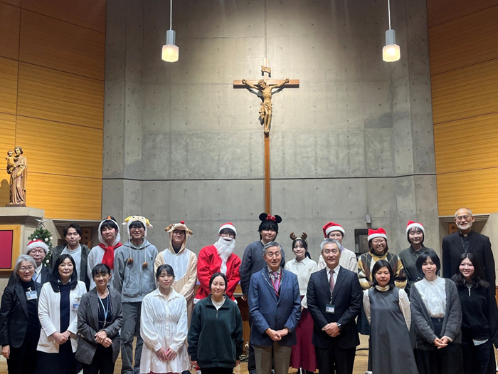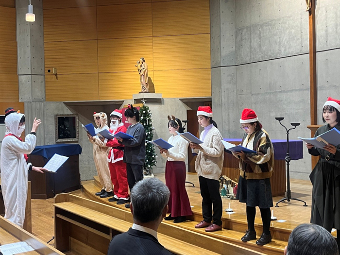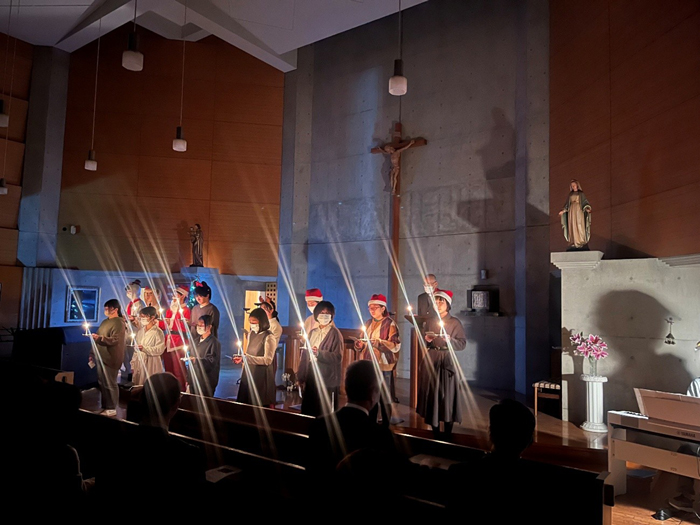 12月16日(火)、特別教育施設「聖堂」にて「クリスマスの集い」が開催されました。 夕刻16時30分、バスロータリーのイルミネーションが点灯すると、キャンパスは一気にクリスマスムードに。18時30分からの本番は、北川学長の挨拶でスタートしました。 キャンドルサービスでは、聖堂がろうそくの柔らかな光に包まれました。小田神父による聖書朗読や、聖歌の清らかな歌声が響き渡り、参加者は心静かに祈りを捧げました。 後半のMCC(マリアンナコーラスクラブ)によるミニコンサートでは、一転して賑やかな雰囲気に。『銀河鉄道999』や『サンタが街にやってくる』など、希望や平和へのメッセージが込められた5曲が披露され、会場は温かな拍手に包まれました。 最後は明石センター長の挨拶で締めくくられ、冬の夜にふさわしい、心温まるイベントとなりました。
