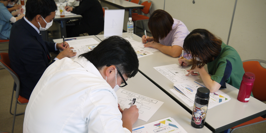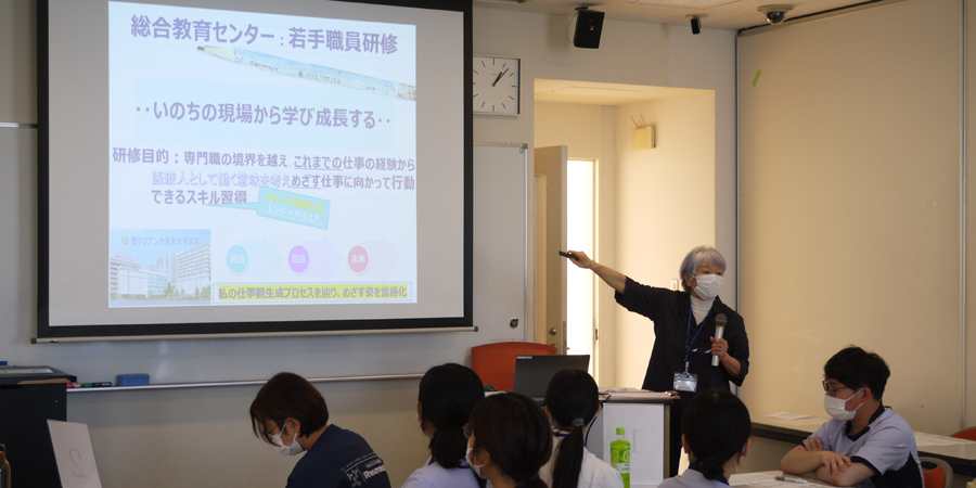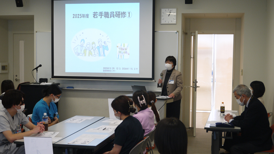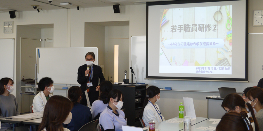 総合教育センターでは入職年数に応じた階層別研修の一環として、入職10年目までの若手職員(看護師・メディカルスタッフ・事務職員等)を対象とする「若手職員研修①」及び「若手職員研修②」を今年度10月から2月にわたり実施いたしました。 「若手職員研修①」は入職2年目から5年目までの職員を対象としており、今年度は計4日間実施。多職種によるグループワークを通し、職場におけるコミュニケーションや後輩指導において必要なスキルの習得を目指す内容となっています。 入職6年目から10年目までの職員を対象とした「若手職員研修②」は、計2日間実施。講師に本学客員教授の陣田泰子先生を迎え、自身の経験から仕事の本質を追求する方法を学び、今後自身が目指すべき姿について考えることができました。 延べ6日間の開催で合計122名の職員が参加し、「他職種の方と交流でき様々な考え方が知れた」、「コミュニケーションの大切さを再認識できた」、「今後の後輩指導に活かしていきたい」、「同年代の多職種と関わる貴重な時間でとても有意義に過ごせた」、「自分の仕事観ややりがいを再認識する機会となった」、「今後の仕事のモチベーションにつながる研修だった」、「他職種の方の現場の声や経験などを共有できた貴重な機会となった」、「今の仕事を目指したきっかけや思いを思い出すことができた」、などの感想をいただいています。 今後も総合教育センターでは、多職種間交流のきっかけとなるような研修を企画・実施してまいります。