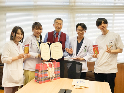 修了式は、上記の理由から2回に分けて実施しました。1名は学長室で北川学長とコンケン大学に留学した本学卒業生の医師たちとともに座談会形式で行い、もう1名は通常通り北川学長、国際交流センターの大平センター長(総合診療内科学 主任教授)、新開先生(小児外科学 准教授)が出席し、実習生が本学での実習についてプレゼンテーションを行いました。
