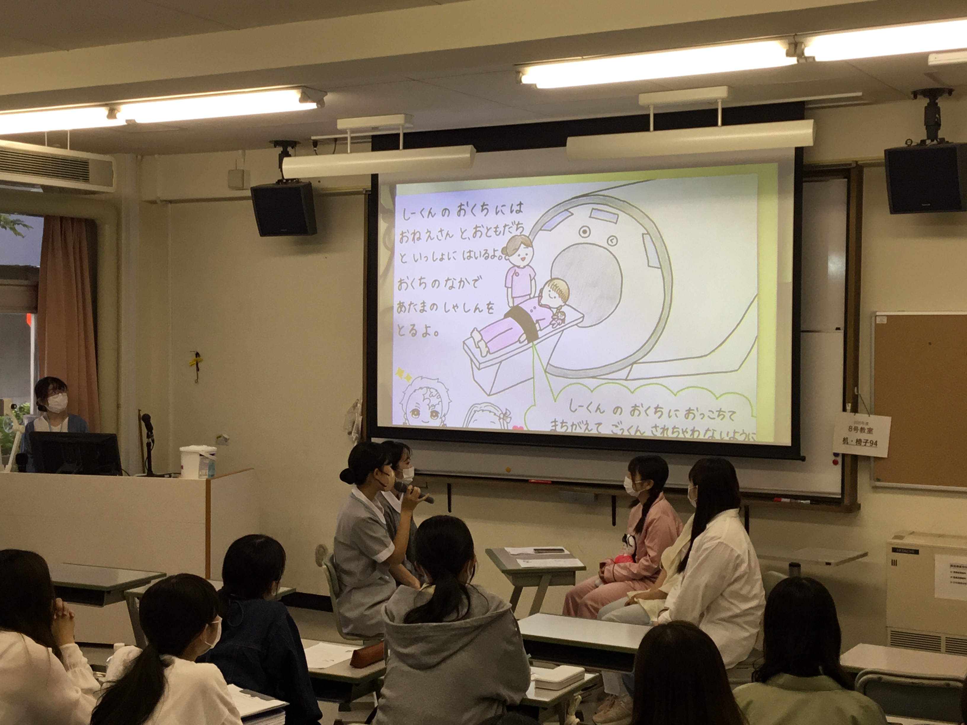 今回、2年生が事例ごとにグループワークをし、子どもの発達段階の特徴と検査や処置による子どもへの影響、家族の想いから、子どもが検査や処置を理解して自主的に受けられるよう、キワニスドールや画用紙などを用いてプレパレーションの準備を行いました。発表会は子ども役・家族役・看護師役などを設定し、ロールプレイで行いました。どのグループの発表内容も、子どもの不安軽減に向けたかわいらしくわかりやすい工夫や配慮を盛り込んで実施されていました。今回の学びを3年次の小児看護学実習でも活用し、子どもの心の準備に役立ててほしいと思います。