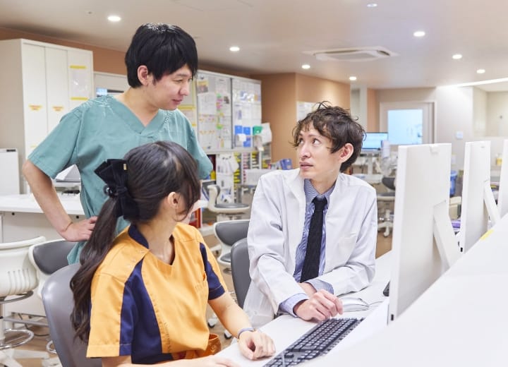 指導医・専門医を中心に、各科と連携しながら診断・治療を行っています。症例検討や治療方針の決定はチームで協議し、多角的な視点を取り入れることで、患者さんに適した治療方針を検討できる体制としています。