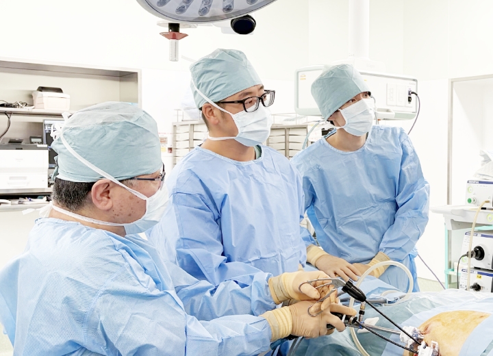 (腹腔鏡手術)当科では、身体への負担をできる限り少なくするために、腹腔鏡手術といった低侵襲手術を導入しています。小さな切開から手術を行うことで、術後の痛みや回復にかかる時間を抑えられることが期待されます。症例ごとに安全性を十分に検討したうえで、開腹手術を含めた最適な方法を選択し、患者さんにわかりやすくご説明しています。