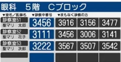 当日は受付時に発行された「本日の受診案内」に記載された4桁の番号でお呼びいたします。ご自身の番号がモニターに表示されるまでエントランス棟などでお待ちください。