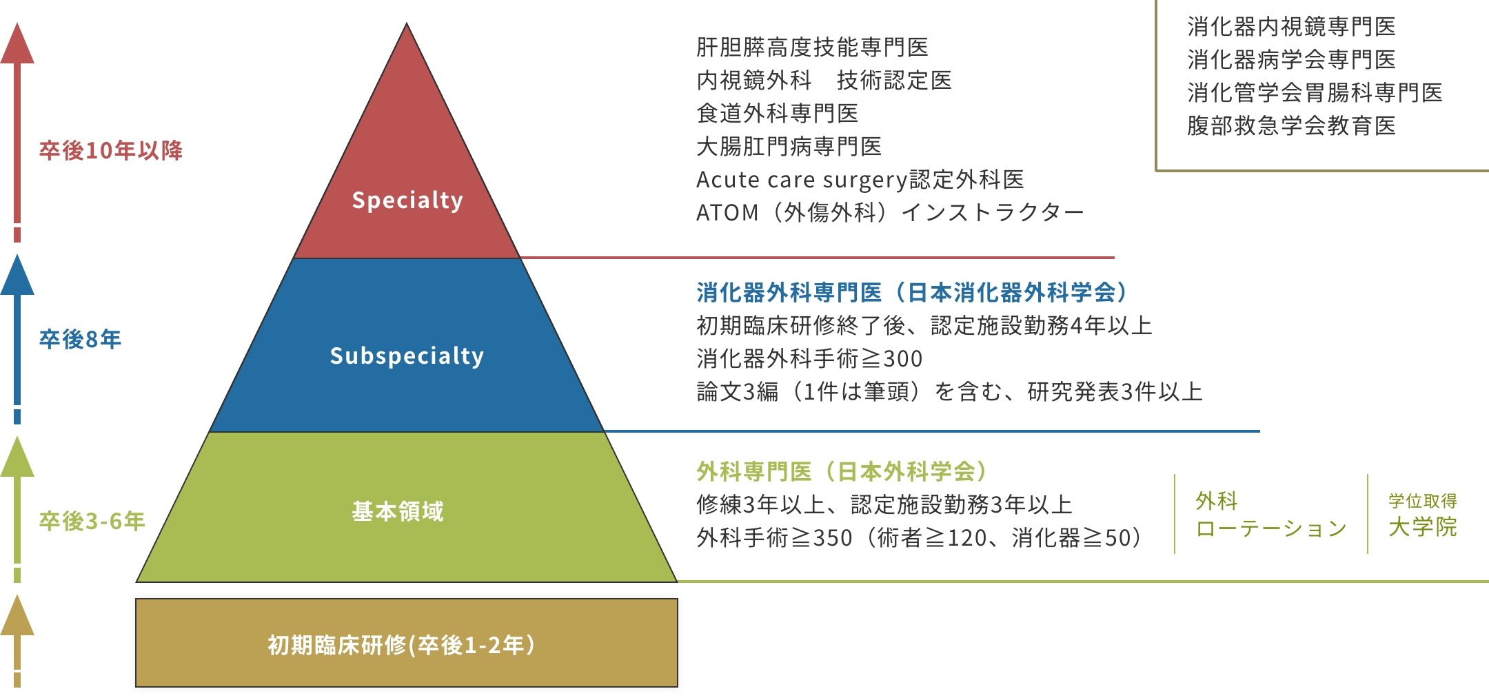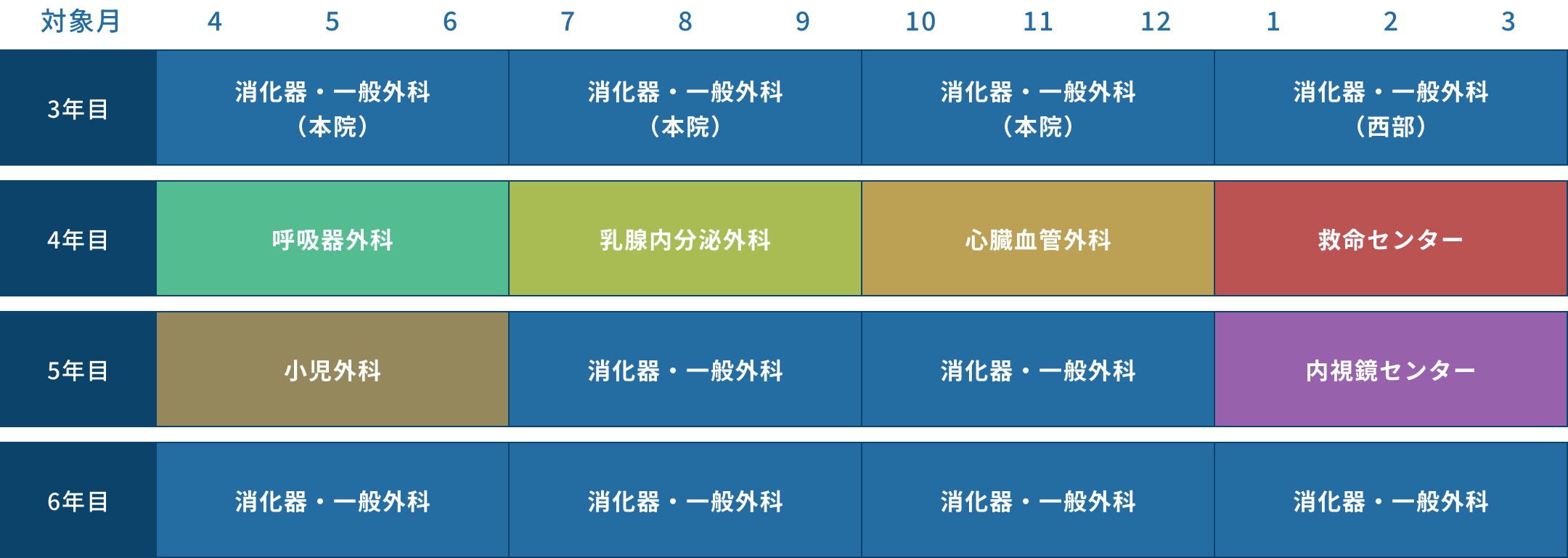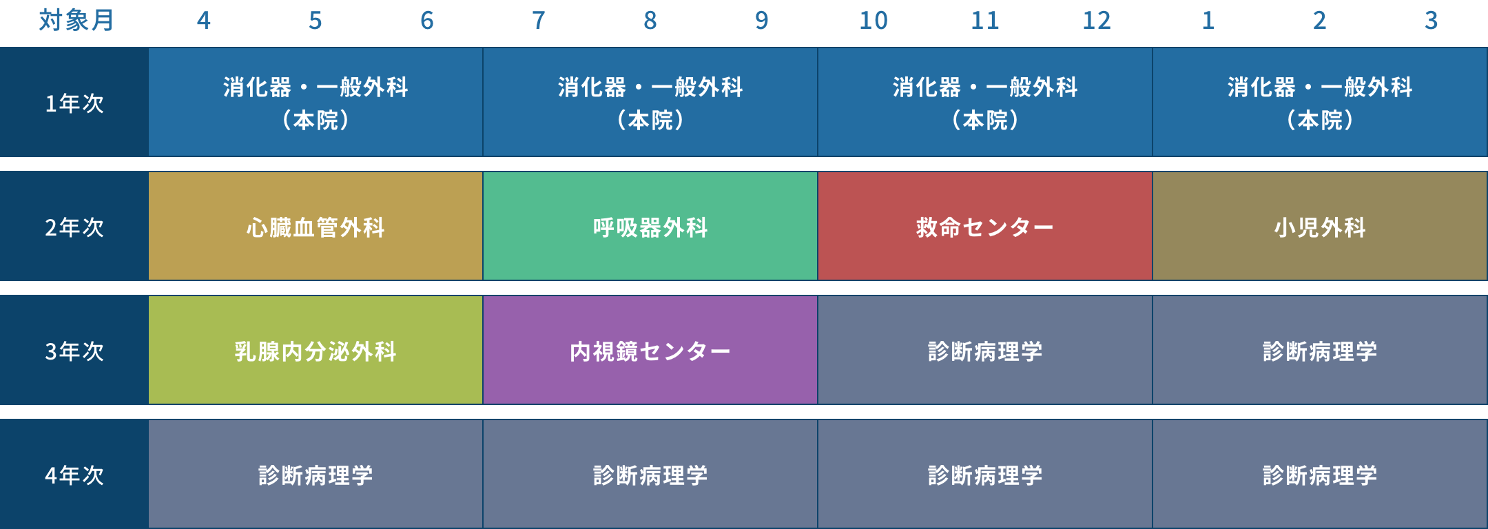 4年間を基本に、消化器・一般外科の知識・技能を段階的に習得します。
